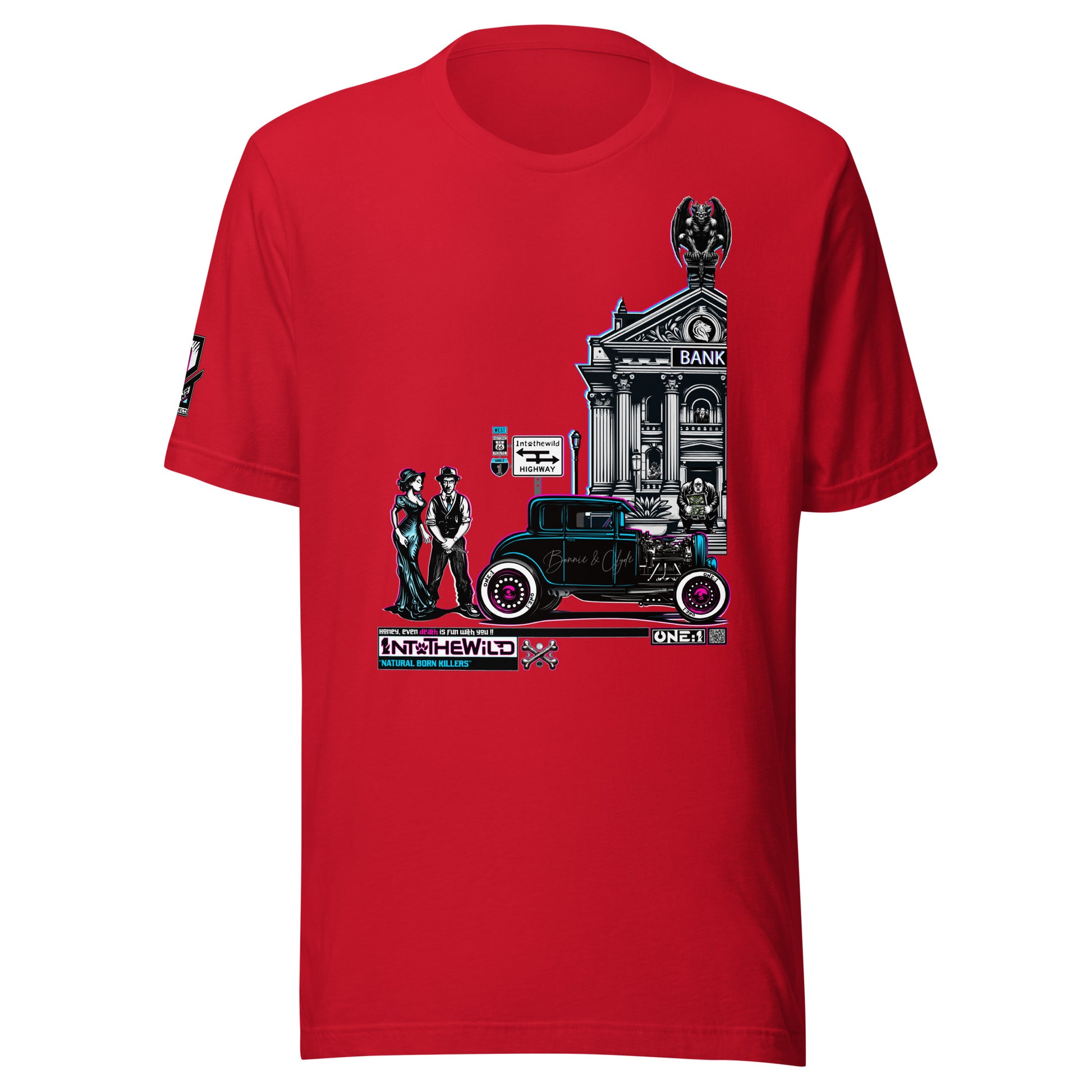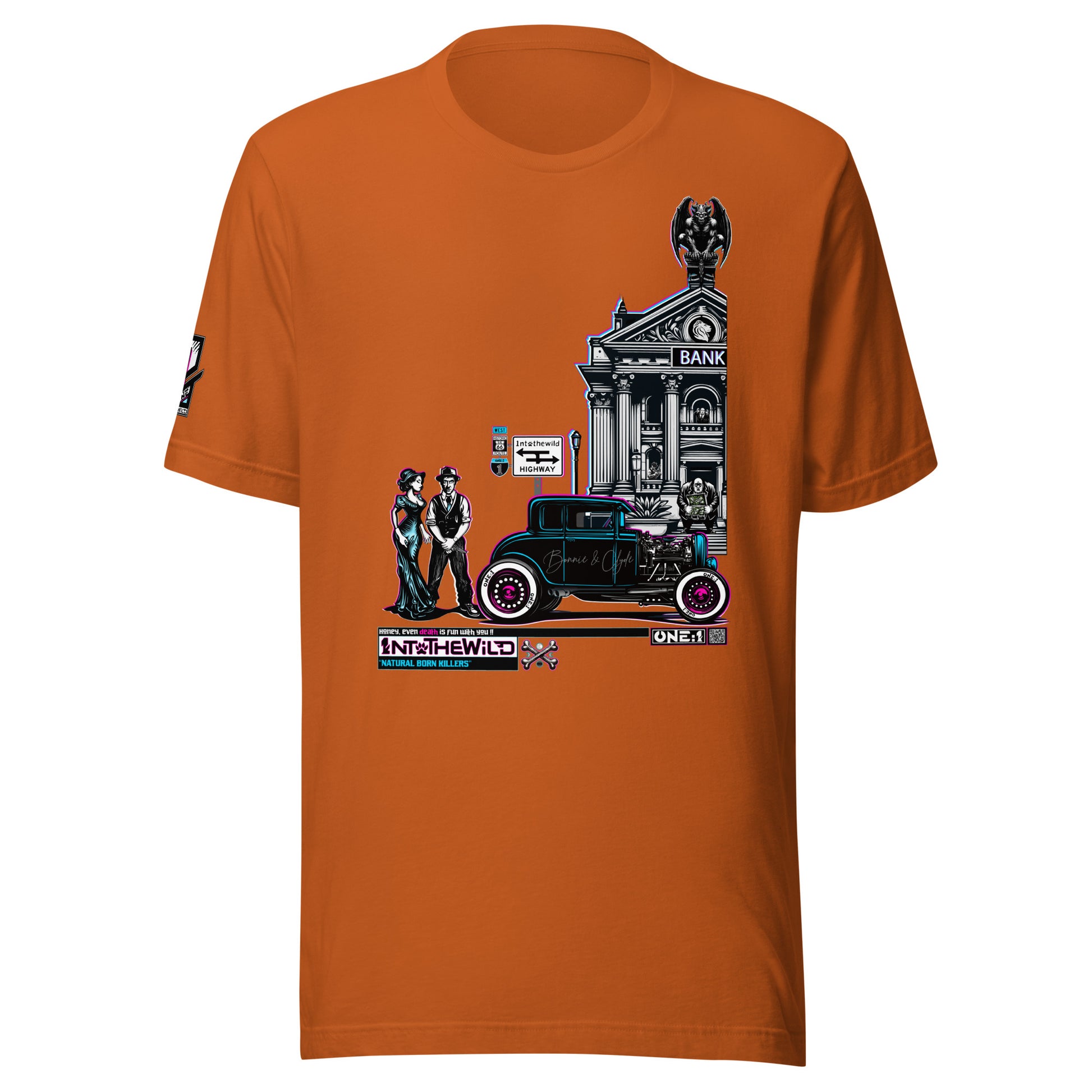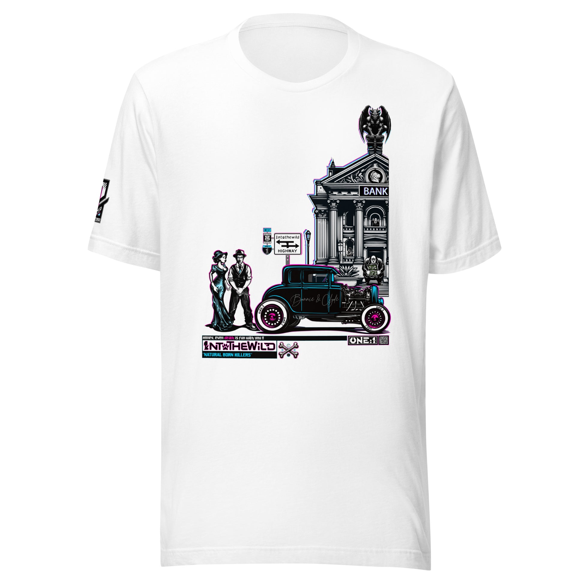 The iconic protagonists, Bonnie & Clyde , pose relaxed during a daring bank robbery, along with their spectacular Ford A-Class HotRod , ready to escape. The typical American signs indicate options towards the highway or the mythical Route 66, to the west. Original and exclusive t-shirt, from the 1ntothewild vision.