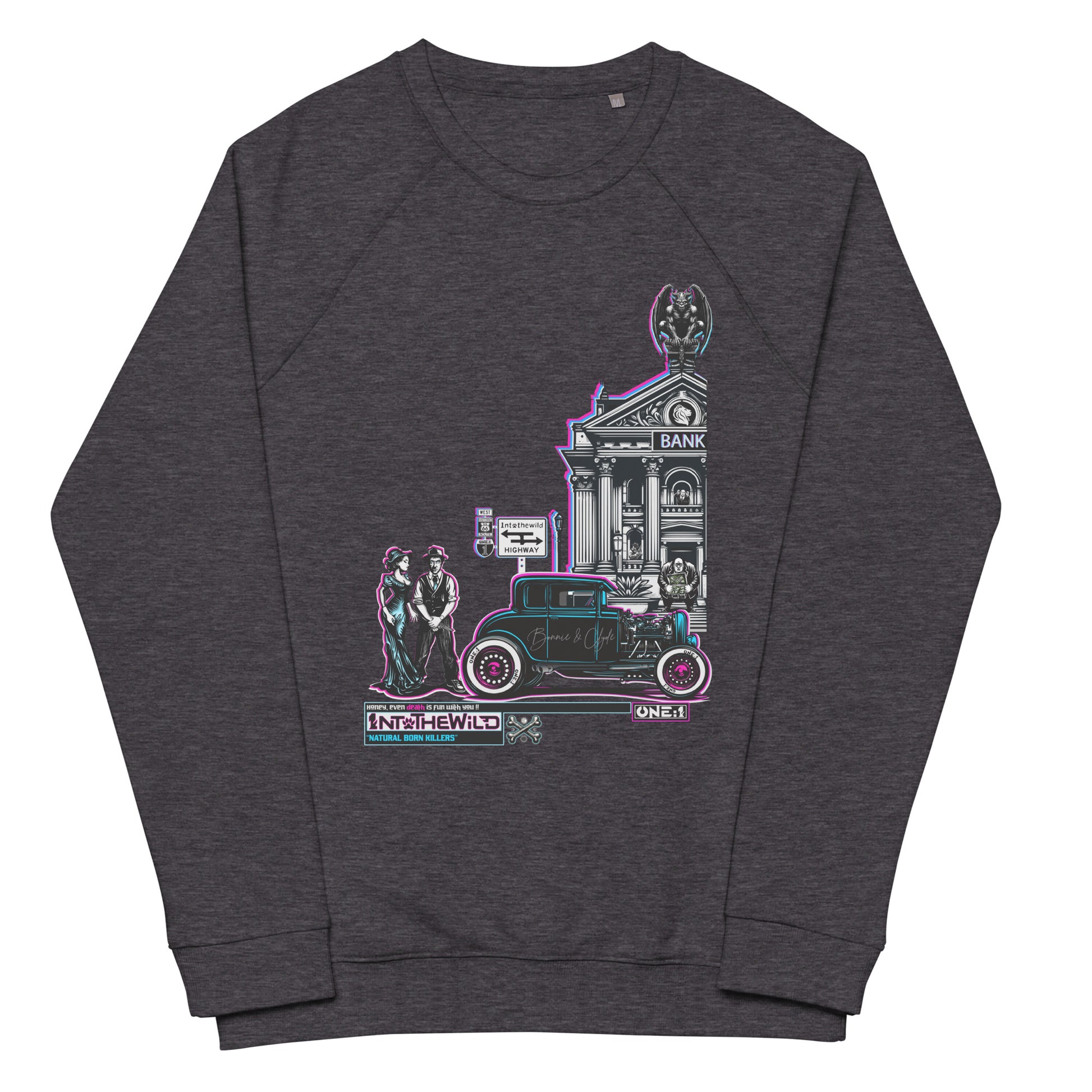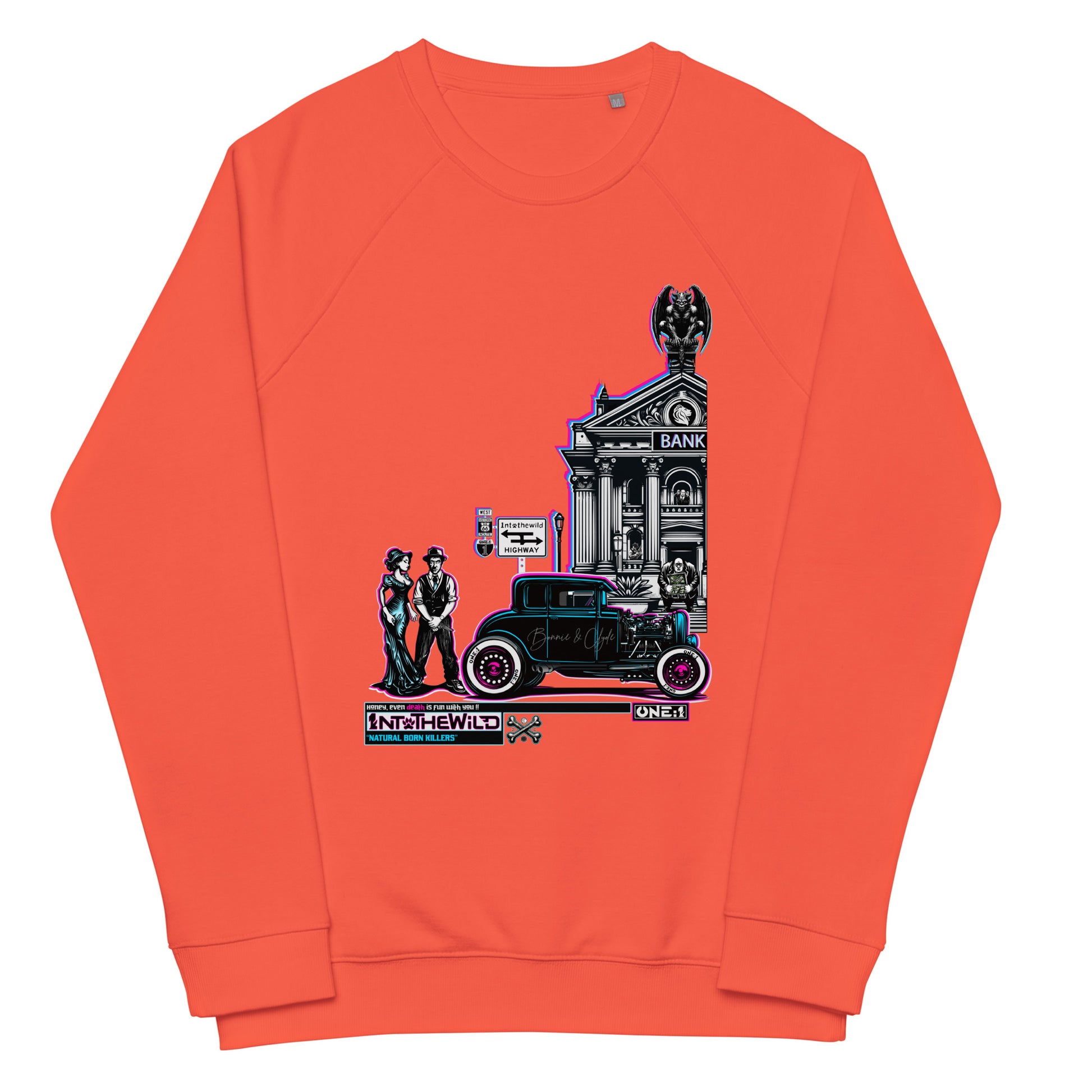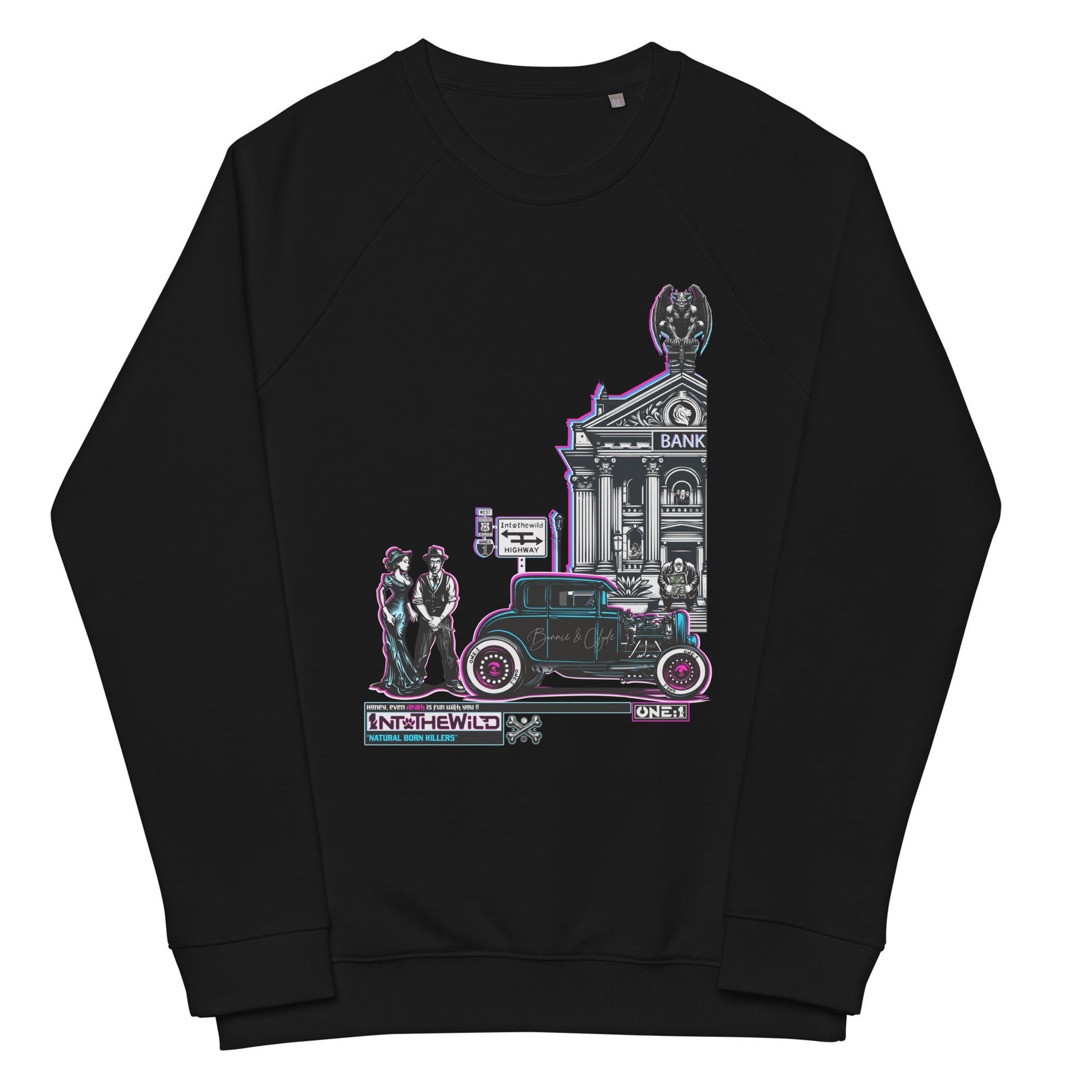 象徴的な主人公たち、 ボニーとクライドは、大胆な銀行強盗の最中に、見事なフォード クラス A ホットロッドの隣でリラックスしたポーズをとり、逃亡の準備を整えています。典型的なアメリカの標識は、高速道路または西の伝説のルート 66への選択肢を示しています。独創的で魅力的なスウェットシャツ、ビジョン 1ntothewild 。