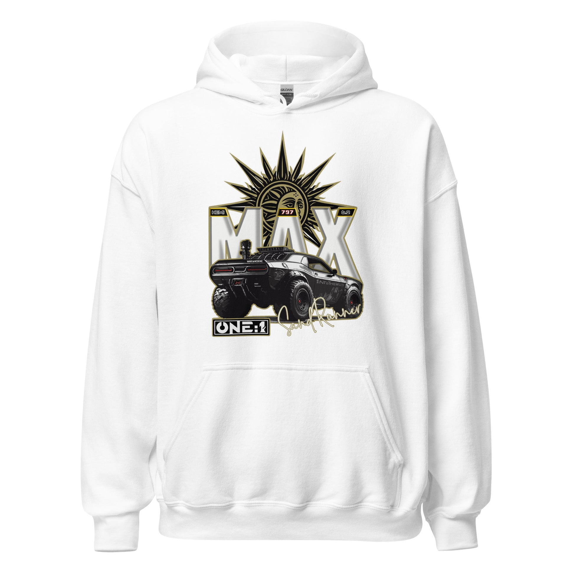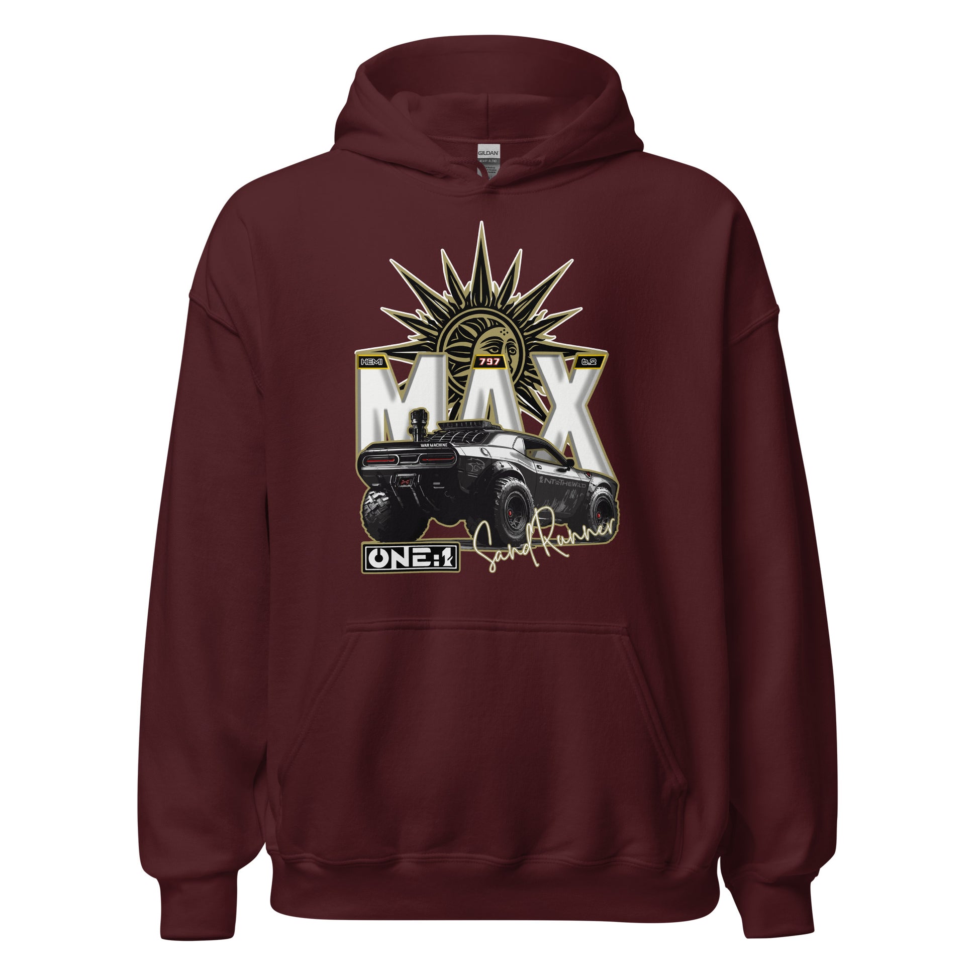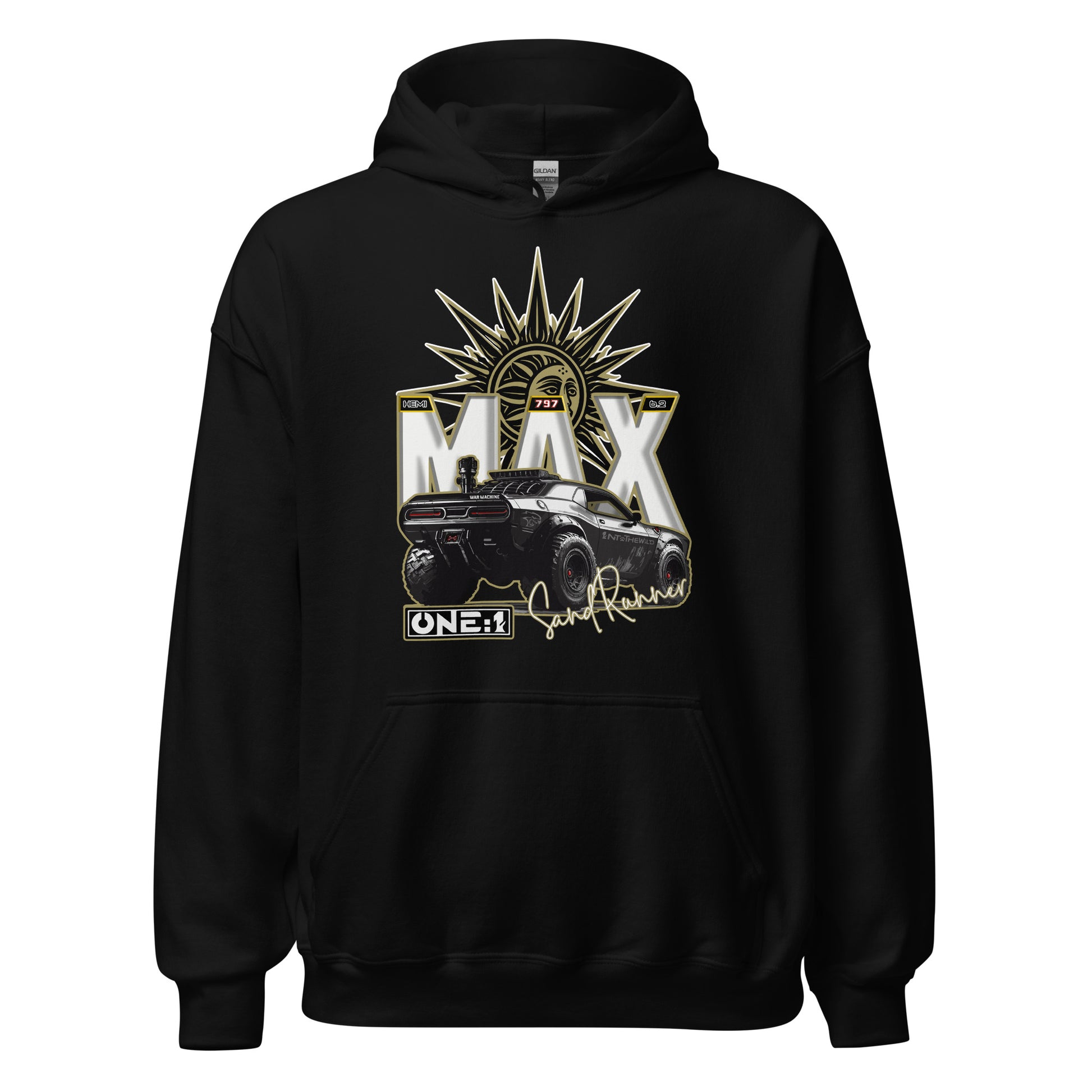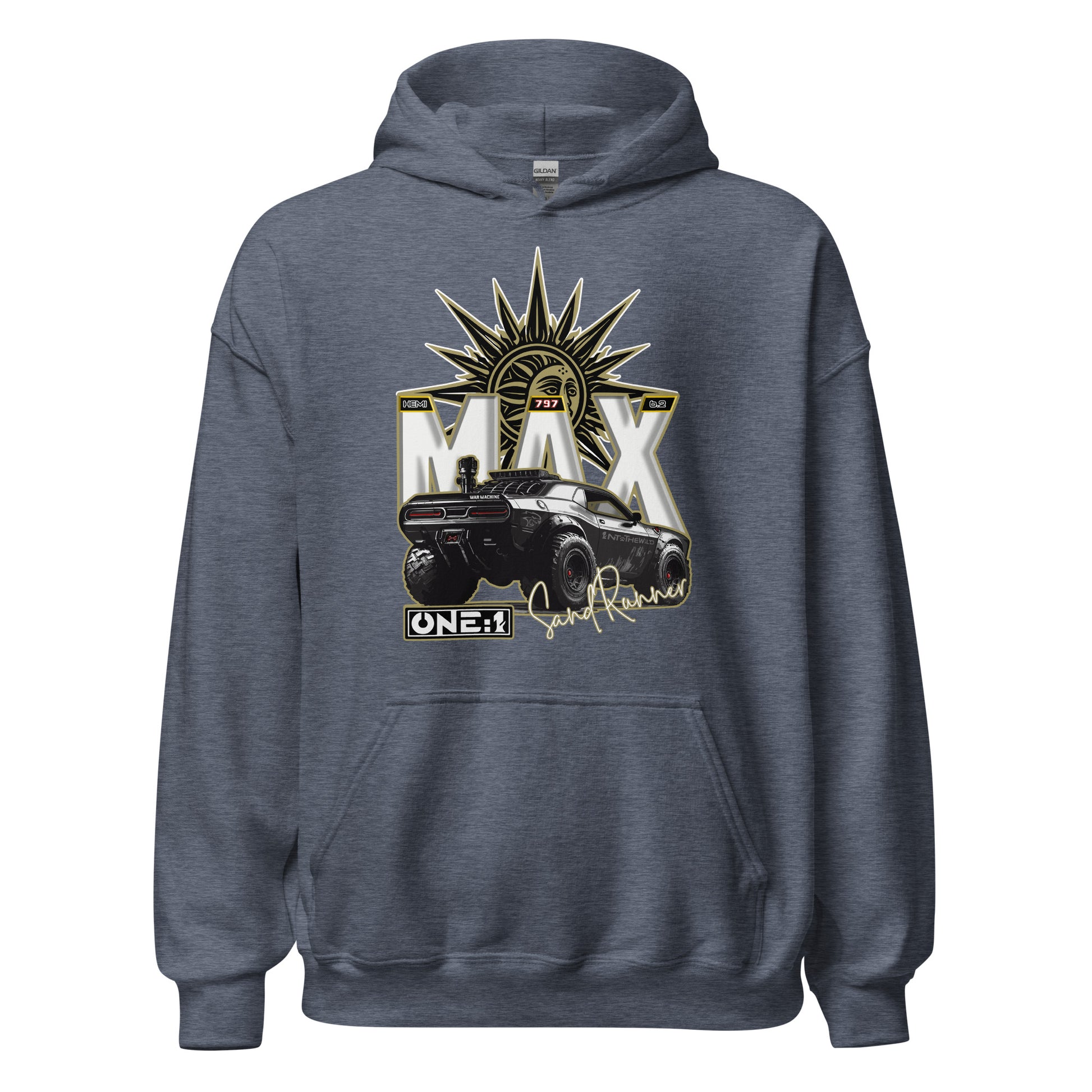 Esta sudadera con capucha War Machine es una sinfonía de ingeniería y estilo, donde la radical estética de este Dodge Challenger se fusiona con el implacable mundo post apocalíptico de la saga Mad Max.