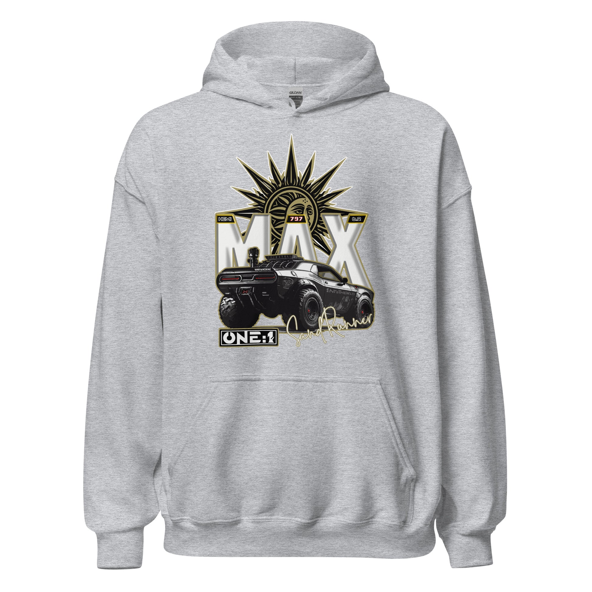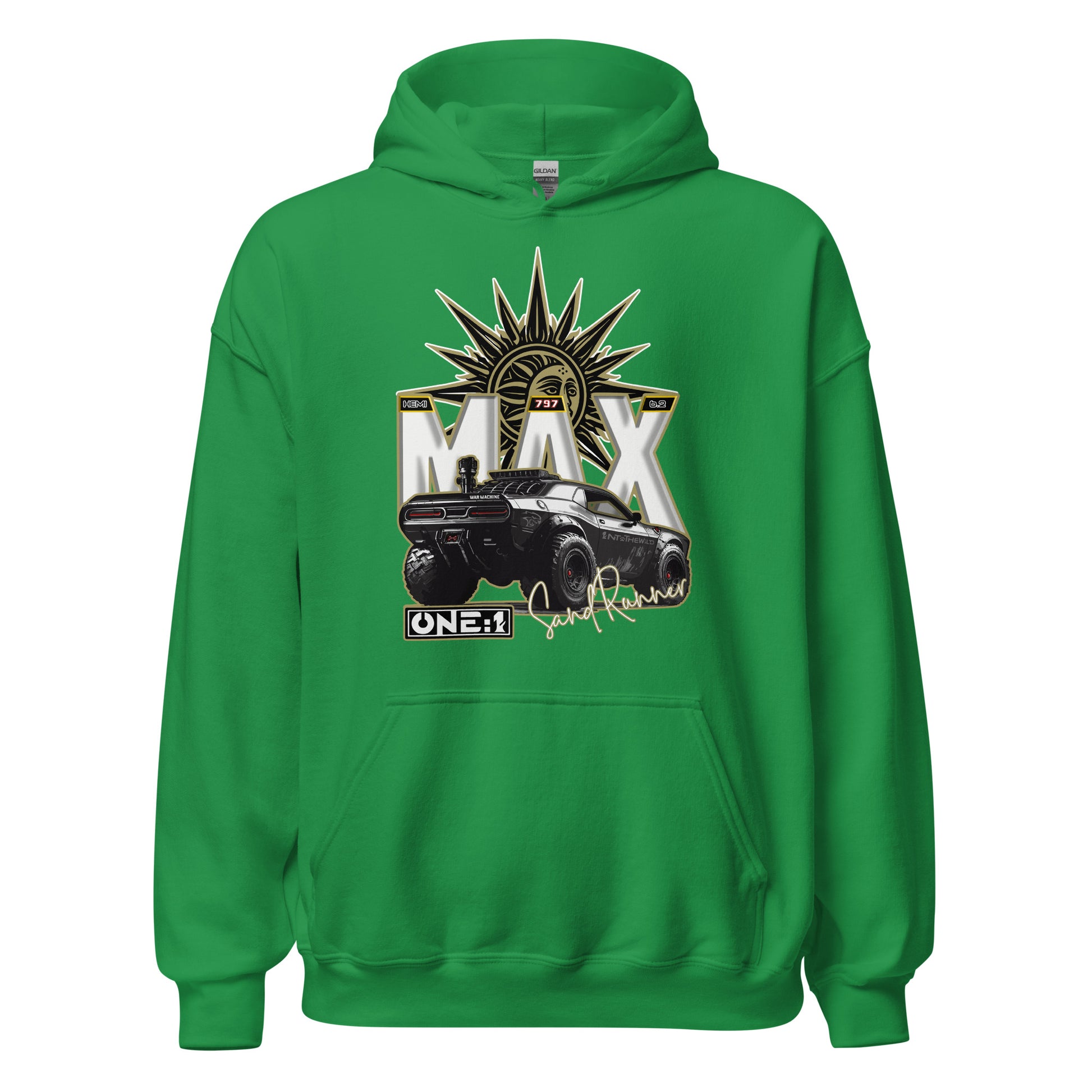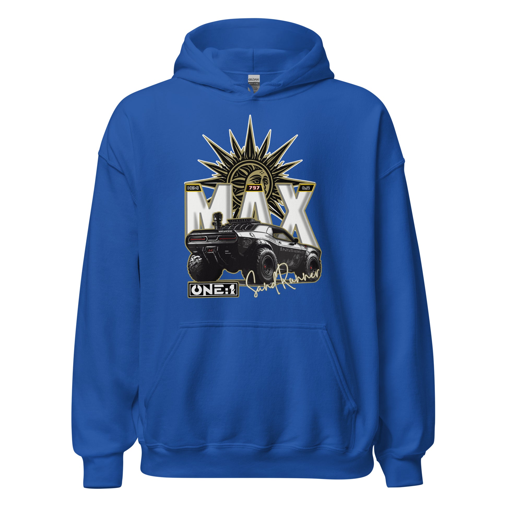 Esta sudadera con capucha War Machine es una sinfonía de ingeniería y estilo, donde la radical estética de este Dodge Challenger se fusiona con el implacable mundo post apocalíptico de la saga Mad Max.